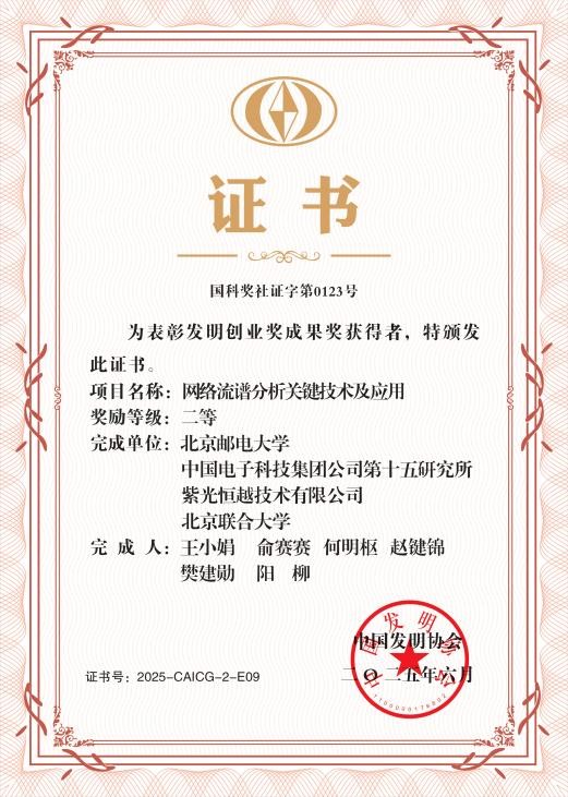 发布时间:2025-09-30近日,紫光恒越作为核心完成单位,凭借《网络流谱分析关键技术及应用》项目成果,荣获国家级奖项——中国发明协会2025年度“发明创业奖成果奖二等奖”,公司总裁樊建勋作为项目主要完成人及公司代表荣获表彰。