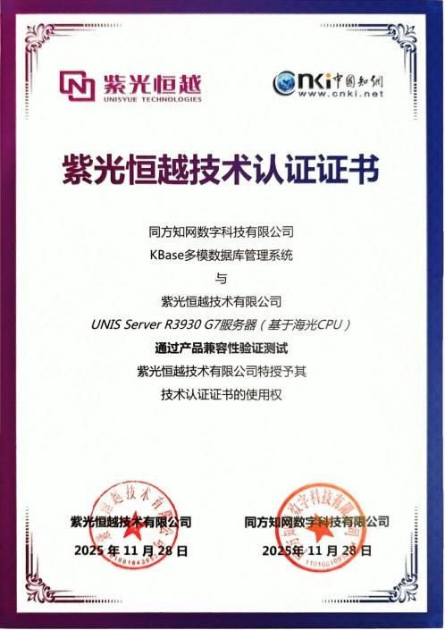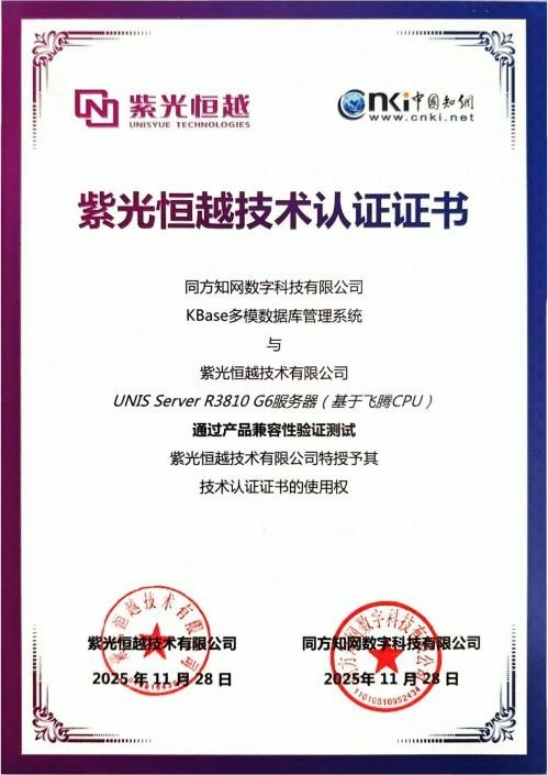 当前,同方知网数科自主研发的KBase多模数据库管理系统,已完成与紫光恒越飞腾、海光系列服务器的兼容性测试,凭借稳定运行表现与优异适配性能,顺利获得紫光恒越颁发的技术认证书。这一成果不仅验证了紫光恒越全栈国产化硬件环境的高可靠性与广泛适配性,更标志着双方技术协同迈出关键一步,为联合解决方案落地奠定了坚实基础。