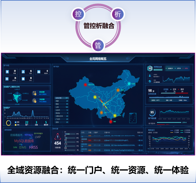 传统园区多套运维软件分散部署,入口多、效率低、成本高。SDN-Campus基于统一数字底座,融合多套运维工具,实现跨域管、控、析融合及一体化管理,通过统一门户、统一资源调度,兼顾管理效率与成本优化,让园区网运维管理从“繁琐运维”转向“轻松管控”。