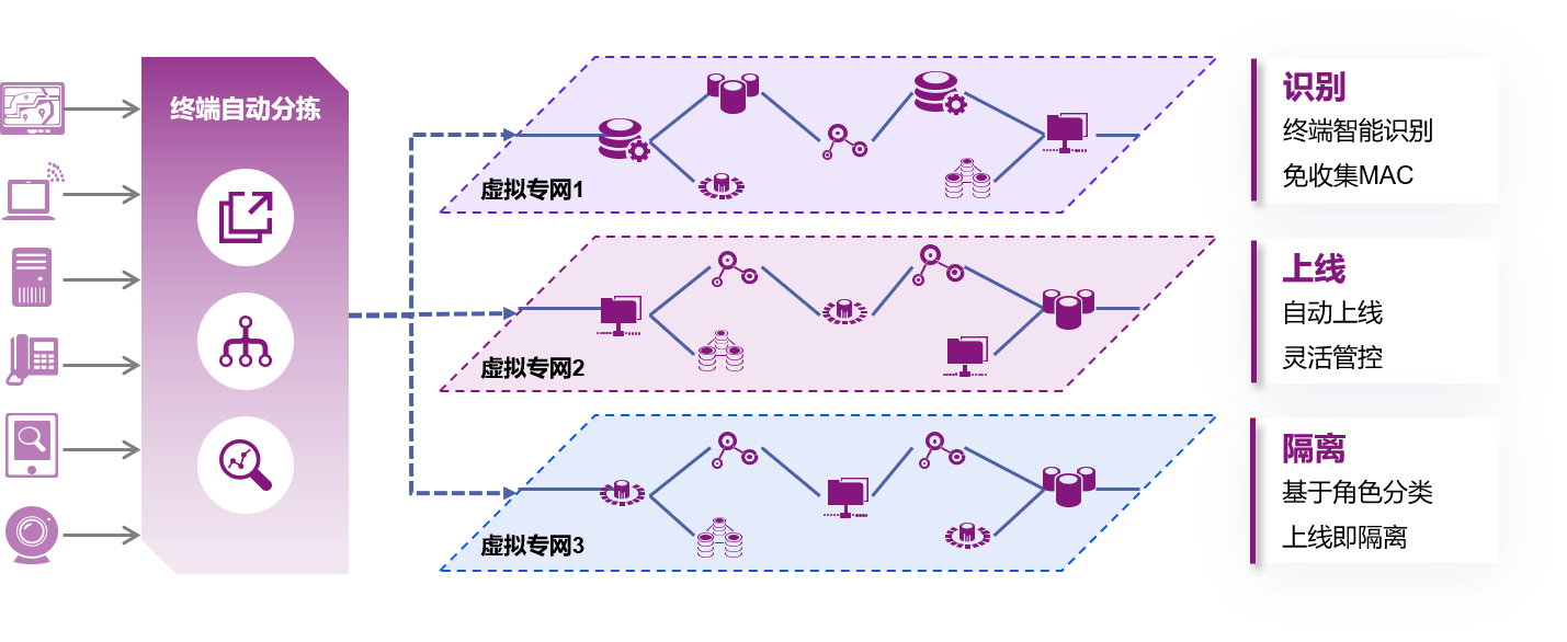 随着智慧园区建设提速,各类物联终端大量接入园区网,传统“手工录入配置”的方式上线效率低,且缺乏安全隔离手段。SDN-Campus专为物联网场景优化设计,支持各类物联终端自动上线,终端上线后通过自动分拣机制进入对应的虚拟专网,虚拟专网可以对不同类型的终端进行业务隔离,从而实现具备终端快速入网、自动分拣、安全隔离与全生命周期管理的智慧物联解决方案。